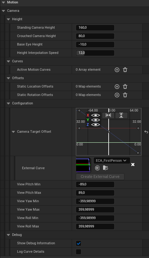 Advanced first-person camera component with integrated curve management, procedural camera animations, height interpolation, and view angle constraints. Features independent camera height tracking, static offset system, and comprehensive debug capabilities.