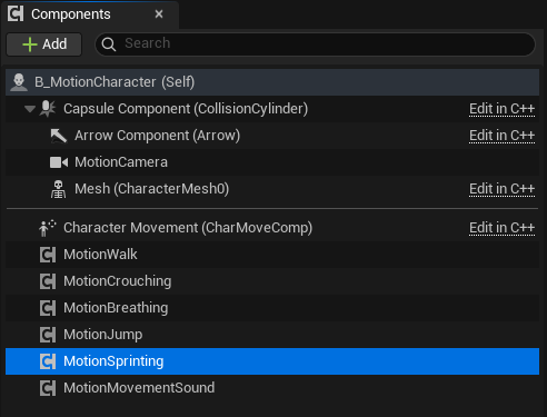 UMotionSprintingComponentto your Character Blueprint or C++ class - Configure the component properties in the Details panel