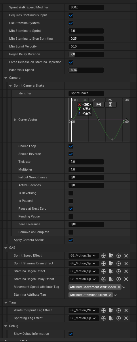 GE_Motion_SprintSpeed- Modifies walk speed for sprintingGE_Motion_SprintStaminiaDrain- Drains stamina while sprinting (optional)GE_Motion_SprintStaminiaRegen- Regenerates stamina when not sprinting (optional)GE_Motion_SprintStaminiaRegenDelay- Blocks regen after exhaustion (optional)GE_Motion_WantsToSprint- Grants wants to sprint tagGE_Motion_Sprinting- Grants sprinting state tag