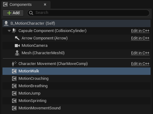 UMotionWalkComponentto your Character Blueprint or C++ class - Configure the component properties in the Details panel