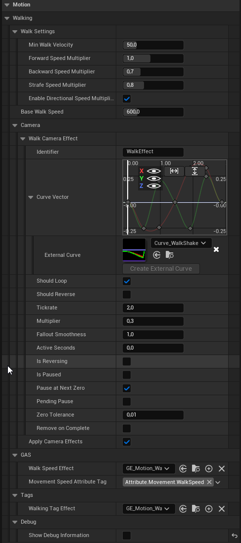 | WalkCameraEffect | FStructMotionCurve | - | Camera curve to apply during walking (subtle camera movement) | - |