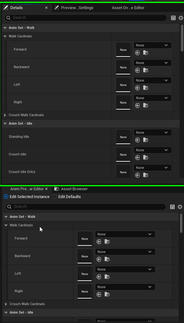 ABP_UnarmedAnimLayersor create a child blueprint ofABP_ItemAnimLayersBase, the base item animation layer, to create a child blueprint for your new item. - Assign item-specific animation assets (blend spaces, pose assets, aim offsets) to the exposed variables.